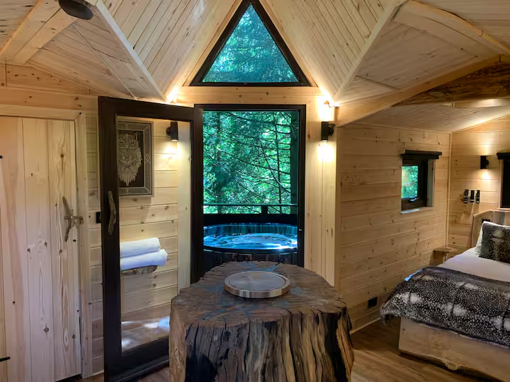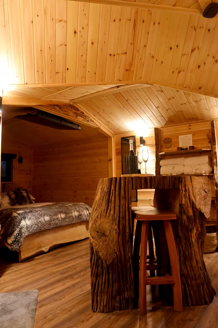 Inside, the Lodge blends comfort and style seamlessly. A fireplace warms the spacious living area, while a gourmet kitchen, spa-inspired bathrooms, and plush bedding ensure total relaxation. Reclaimed wood and stone add to the serene, earthy ambiance.