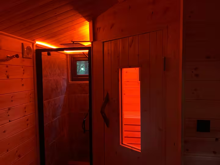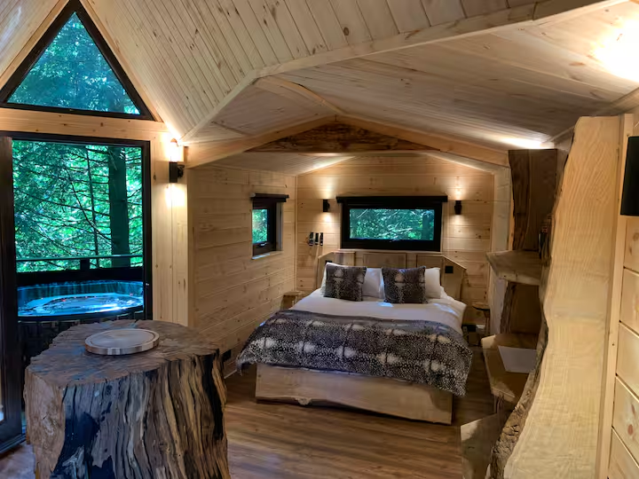 Inside, the Lodge blends comfort and style seamlessly. A fireplace warms the spacious living area, while a gourmet kitchen, spa-inspired bathrooms, and plush bedding ensure total relaxation. Reclaimed wood and stone add to the serene, earthy ambiance.